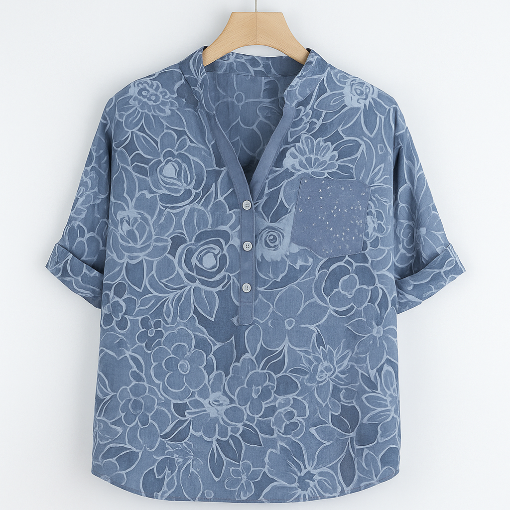 Elisa™ přináší spojení pohodlí, svěžesti a ženského stylu. Vyrobená z lehkého, prodyšného materiálu, nabízí volný střih pro maximální komfort během teplých dnů. Jemný modrý základ s bílými květinami a náprsní kapsa dodávají halence uvolněný, ale elegantní vzhled – ideální pro letní dny i volný čas.